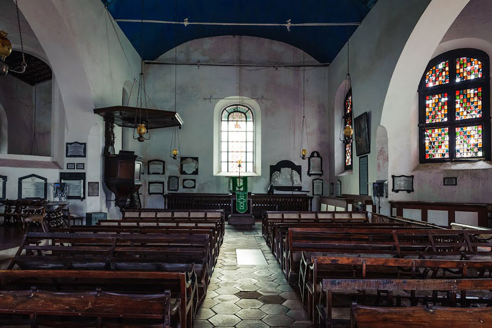 Interior of the Galle church. To the left, on the wall, is a peculiar mural tablet bearing the coat of arms of Abraham Samlant, a well-known Commandeur of Galle in the 18th century.